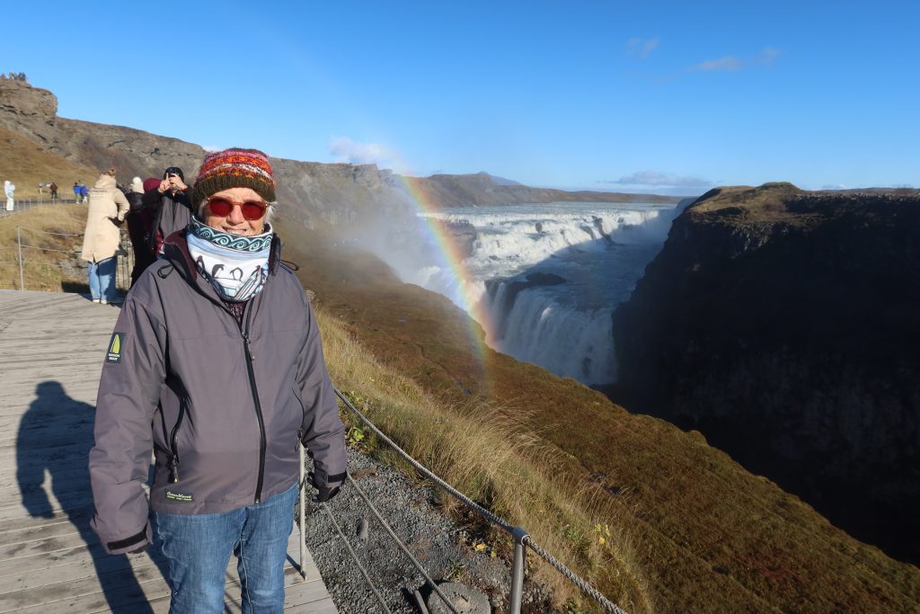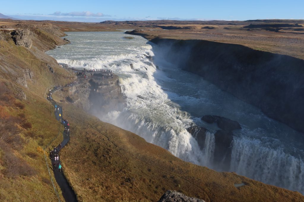 From Þingvellir we headed to the outer extremity of the Golden Circle – the Gullfoss waterfall. This waterfall is on the Hvítá river and at Gullfoss it turns sharply to the west and flows down into a wide curved three-step “staircase”. It then abruptly plunges down two stages ( the first is 11 metres in height, and the second 21 metres) into a crevice 32 metres deep. Vast amounts of water flow over the falls – in the summer around 141 cubic metres per second and it is seriously impressive. As with any powerful and plentiful resource of this nature, there have been attempts to monetise it. Right up until the late 20th century there have been attempts to use the falls to generate electricity and during this period, the falls were rented to foreign investors. For various reasons, partly related to a lack of funds raised, these attempts failed, but Sigríður Tómasdóttir – the daughter of the co-owner – should also be credited with preventing this exploitation. Her dedication and advocacy for legal protections against foreign control of it certainly helped raise the profile of the cause. Indeed, she regularly threatened to throw herself down the falls. She is rightly memorialised by a stone memorial above the falls.
