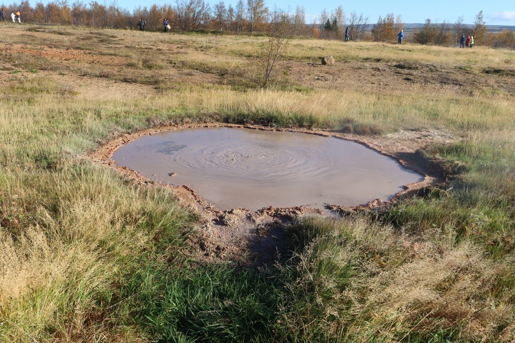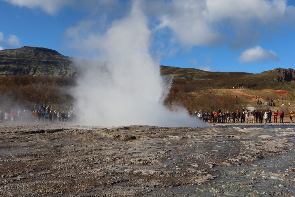 From Gullfoss we headed to the last stop of the day – the Haukadalur valley. This is a geo-thermal area – indeed, arguably it is the most famous geo-thermal area given that its most famous geyser is called Geysir – the name we now give to this phenomenon of heated waterspouts. The Geysir geyser is now dormant, but there is now active one called Strokkur which goes off every 5-10 minutes. Unsurprisingly, it is constantly surrounded by people and cameras, all waiting for it to suddenly go off. Once it does, there is a rotation of people and cameras all waiting for the next one and then another rotation of cameras and so on …… The Strokkur geyser is thought to have started spouting in around 1789 when an earthquake unblocked it and in 1815 is thought to have been around 200 foot high. However, at the turn of the 20th century, another earthquake blocked it again. In 1963 locals drilled though the blocked conduit and it has been erupting ever since.