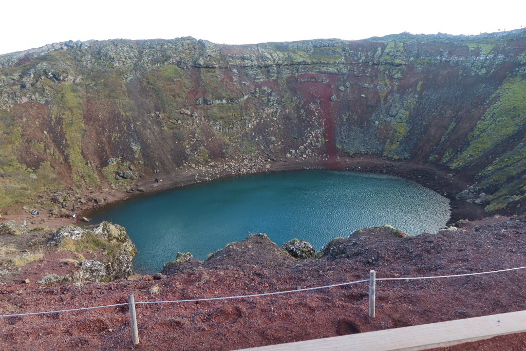 A final stop was the Kerið crater. This is the northernmost of four craters located along an 800-meter fissure called the Tjarnarhólar. The crater seems to fit perfectly our perception of what a crater should look like – an almost perfect sphere with a relatively steep slope straight down into it and a spherical lake at the bottom. There is a short walk right round the crater and it is possible to descend down a path into, but we figured that what goes down has to come up again, so we stayed at one level – the top! As with everything so far today we had to pay a fee, but this one offered us free (limited) parking – we simply had to pay to get into the site. All the other sites we have had to pay for the parking instead! The land the crater is on is now owned by a private company – Arctic Adventures – so the fee goes to them ….