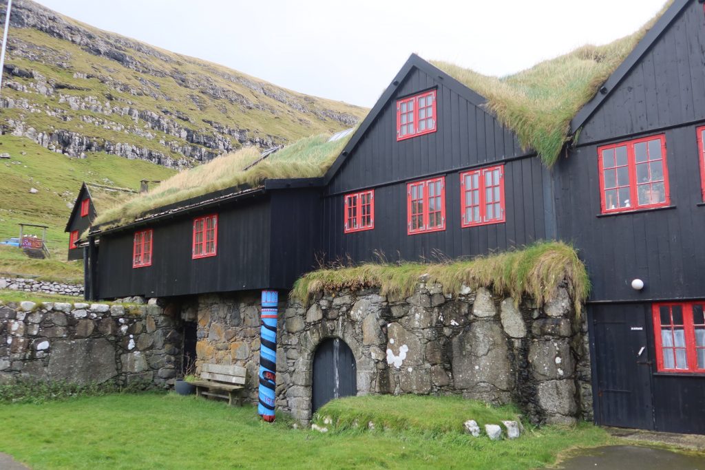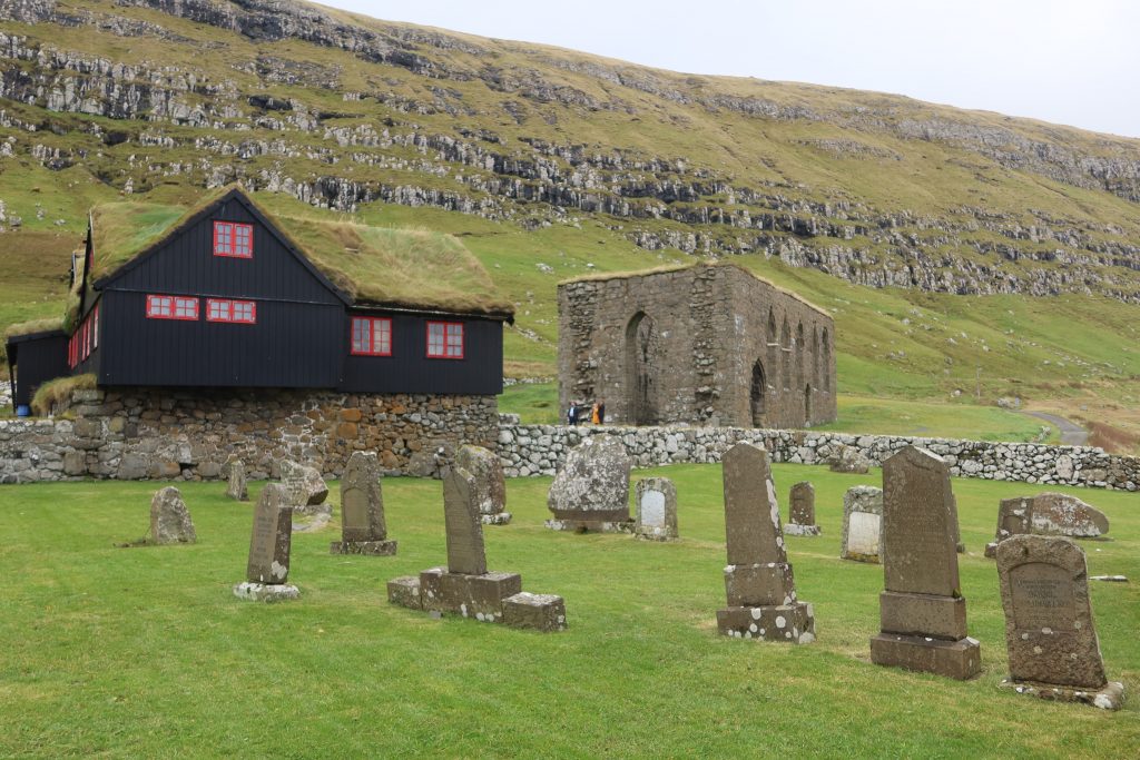 For the afternoon Gijs had arranged for a few taxis to give us a tour of the island and around 1.30pm they duly arrived to pick us up. We split into our watches (seemed the easiest way to organise who went in which taxi) and headed off. The first stop was what the taxi drivers described as the ‘Old Church’. In fact it was a small village called Kirkjubøur. This apparently owes its existence to the vagaries of the wind and currents. The Faroes have no trees as such and so when driftwood washed up on the shores here it seemed almost like a sign to the Irish hermits who first lived here. The wood (for building and fires) was coupled with copious amounts of seaweed which made a good fertiliser for the very poor soil. The Irish though apparently fled as the Vikings took over and also adopted here to land and live and in the 10th century Kirkjubøur flourished. A church was built here and as religious power started to dominate, they also built the medieval Magnus Cathedral. This was finished at the start of the 14th century and served as the main Faroe Islands cathedral until the reformation in 1538. The cathedral still stands, but is sadly roofless. Nevertheless, it is still dominant in what is a relatively small settlement and it walls, which are around 1.5m thick are a testament to medieval builders. Given it is roofless, perhaps this says less about medieval roofers! The village also has various turf-roofed farmhouses and a parish church (the oldest still in use in the Faroes) and the overall effect is timeless and feels like a window to another age.
